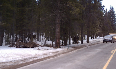 But an even rarer treat on this particular trip, was spotting some moose along the road, on our initial trip in to Estes Park. There were three of them, and they were right by the road. We stopped mid-highway (us and three other cars) to gawk out the window for awhile.